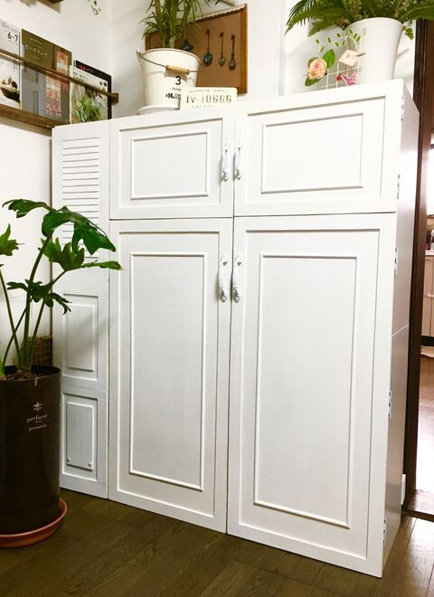 カラーボックスに飾り扉を付けて 大容量のアンティーク キャビネット風に 暮らしニスタ