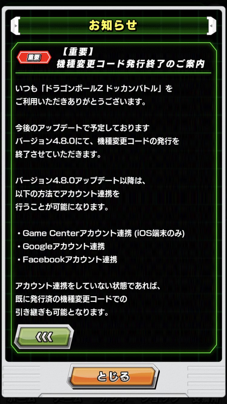 バード ドッカンバトル ドッカンバトル Ver4 8から機種変更のコードが終了 現在4 6だけど 4 7飛ばして4 8のアップデートくる